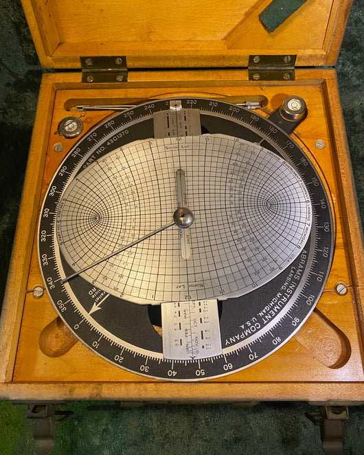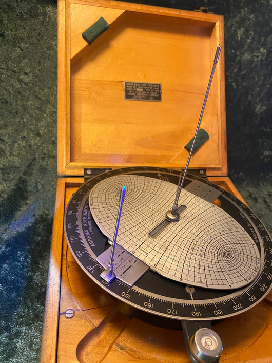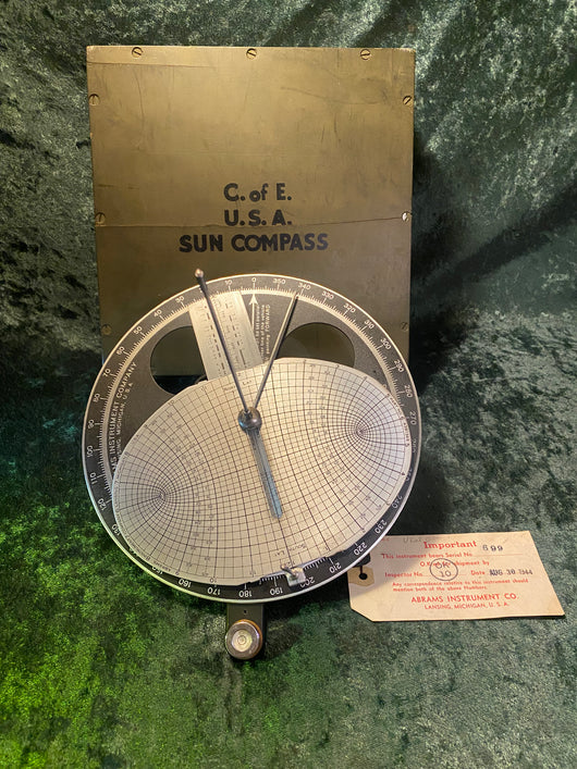 This unique devices were used in WW2 in bombers to find the true North, in the North African Desert (on tanks and other vehicles) and later in expeditions to North Pole or South Pole where the normal compass does not work properly. The device is using the azimuth of the sun to obtain a true direction. The Abrams Universal Sun Compass is made by Abrams Instrument Co. Lansing Michigan. This particular model has the serial number 699 and the inspection tag matching the plate on the case dated August 30 1944.