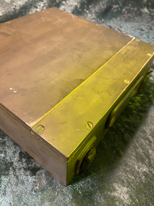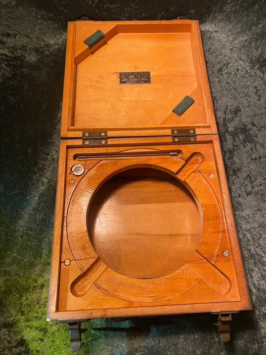 The device is in excellent condition with most of the parts and accessories: solar plate, date bar, protractor plate sub assembly ( 8 1/2 in diameter), bar shadow, 2 gnomon rods, 2 shadow rods (one 6 1/2 inch one 3 1/4 inch ), 2 level vials and gimbal mounting with 2 screws. The case contains 2 original instruction manuals dated November 1943, one of the instruction manual is affected by water and the pages are glued together. The original wood case is in very good condition with a few cracks on the bottom and central section. Dimensions: 9 3/4 inches x 9 3/4 inches and 3 5/8 inches. Excellent addition to your navigational instruments collection.