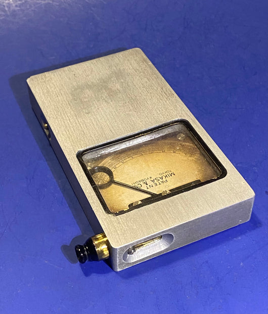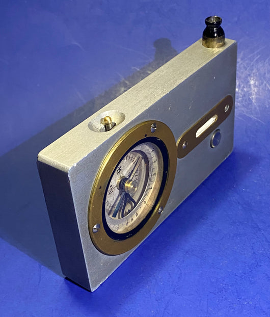 This pocket Omnimeter compendium made by Mikasa & Co Tokyo Kyobashi Japan in mid 1900's combines a compass, clinometer, hand level, contact level, therefore will indicate magnetic bearings, azimuth angles, altitudes, levels and slopes. The combination is arranged in a rectangular heavy duty aluminum and brass frame. The 37 mm diameter compass has a nice silvered dial with a magnetic needle who seats on agate stone, a nice brass level and a side locking system. The rectangular mining clinometer is a pendulum type and has the dial activated by squeezing a small silver button. The the hand level can be found attached inside of the frame. A small retractable sight with a nice crosshairs is present at the end of the device. Dimensions: 108 mm L x 59 mm W x 15 mm H. The condition of the device is excellent with minimal wear and tear due to the age.