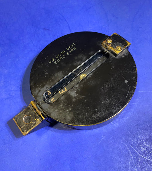 Featured below is an early example of genuine pocket prismatic compass most likely made around WW1 Era England for Eugene Dietzgen and used by US Engineering Department. The compass is complete and comes with original adonized brass case with a fordable prism, sight vane incorporated in the lid , a nice floating unusual black card face and locking system. The original leather pouch in very good condition for the age with missing the front strap. Dimensions: 80 mm diameter and 21 mm height.