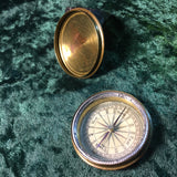 SOLD-This is an excellent example of a brass pressfit domed compass made in Germany early 1800s designed for travelers and settlers and introduced in US by outfitters and early explorers. This specific item has the makers name Negelein above the North sign and the magnetic declination arrow pointed to 18 degrees West. Each device is unique in its own way due to the attractive printed paper dial and custom hand painted compass rose. Diameter: 54mm and height 14mm.